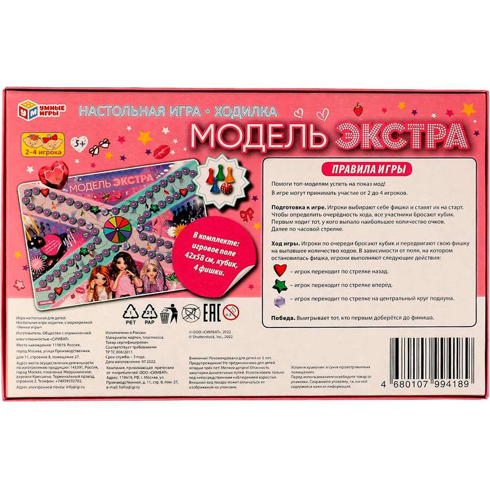 Комплектация: игровое поле - 1 шт., фишка - 4 шт., кубик - 1 шт., правила игры