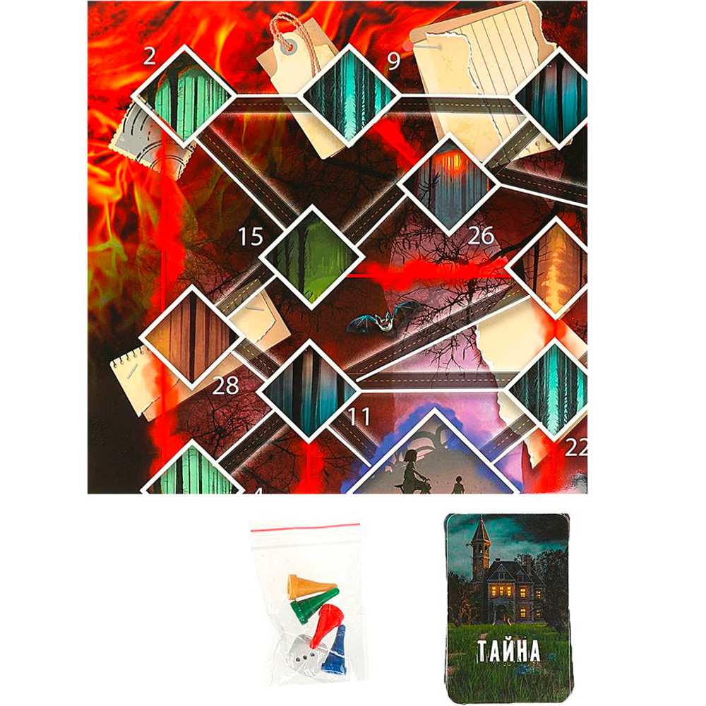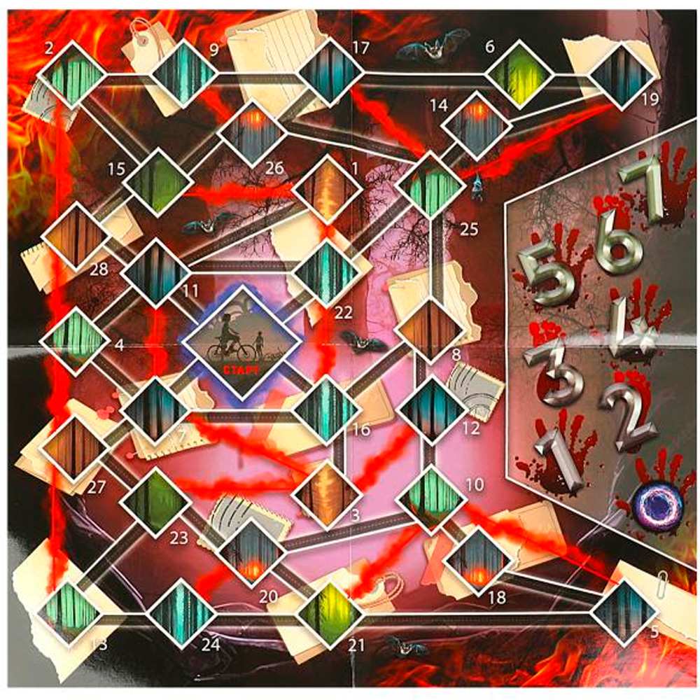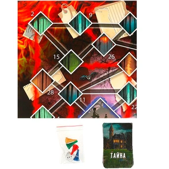 Комплектация: игровое поле, 4 жетона здоровья, 30 жетонов поиска, 7 жетонов параллельного мира, 3 жетона помощи, 5 жетона улик четырех цветов, 14 карт «Телекинез», 20 карт «Тайна», 10 карт «Диверсия», 40 жетонов репутации, 4 фишки, игральный кубик, правила