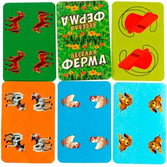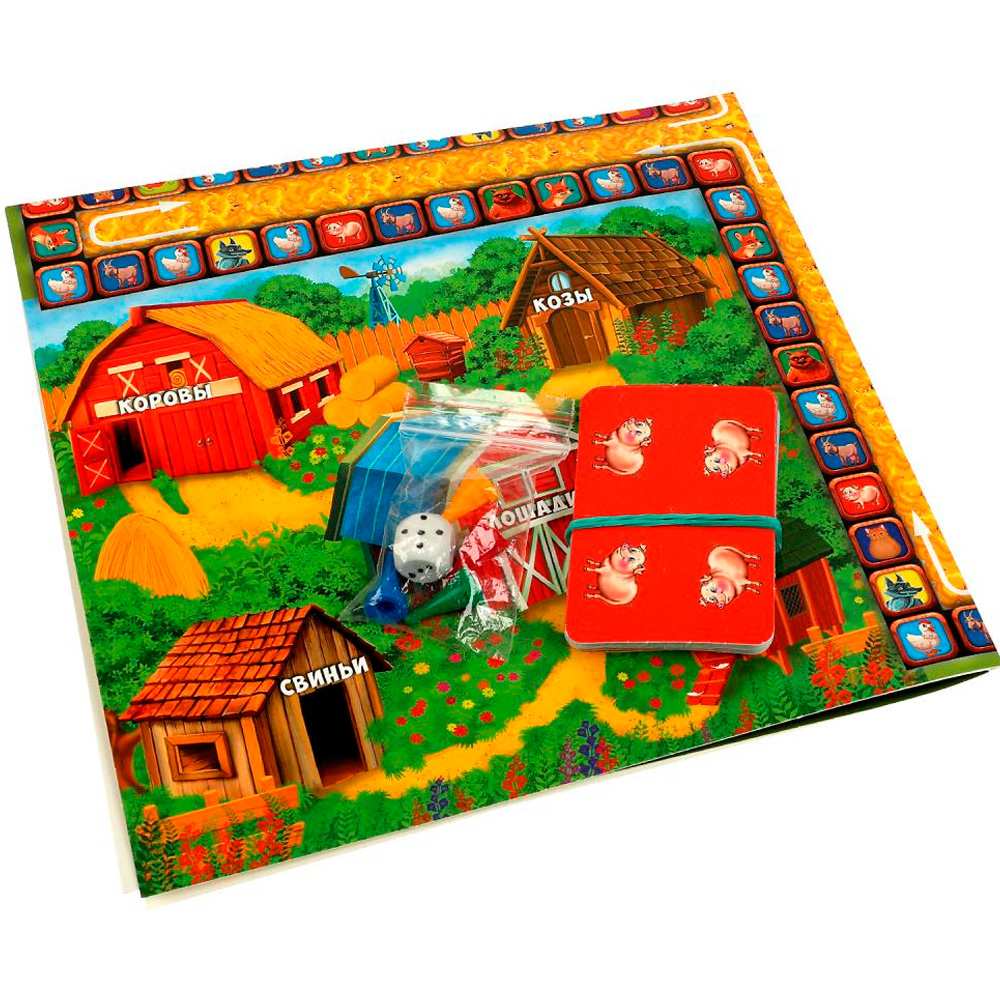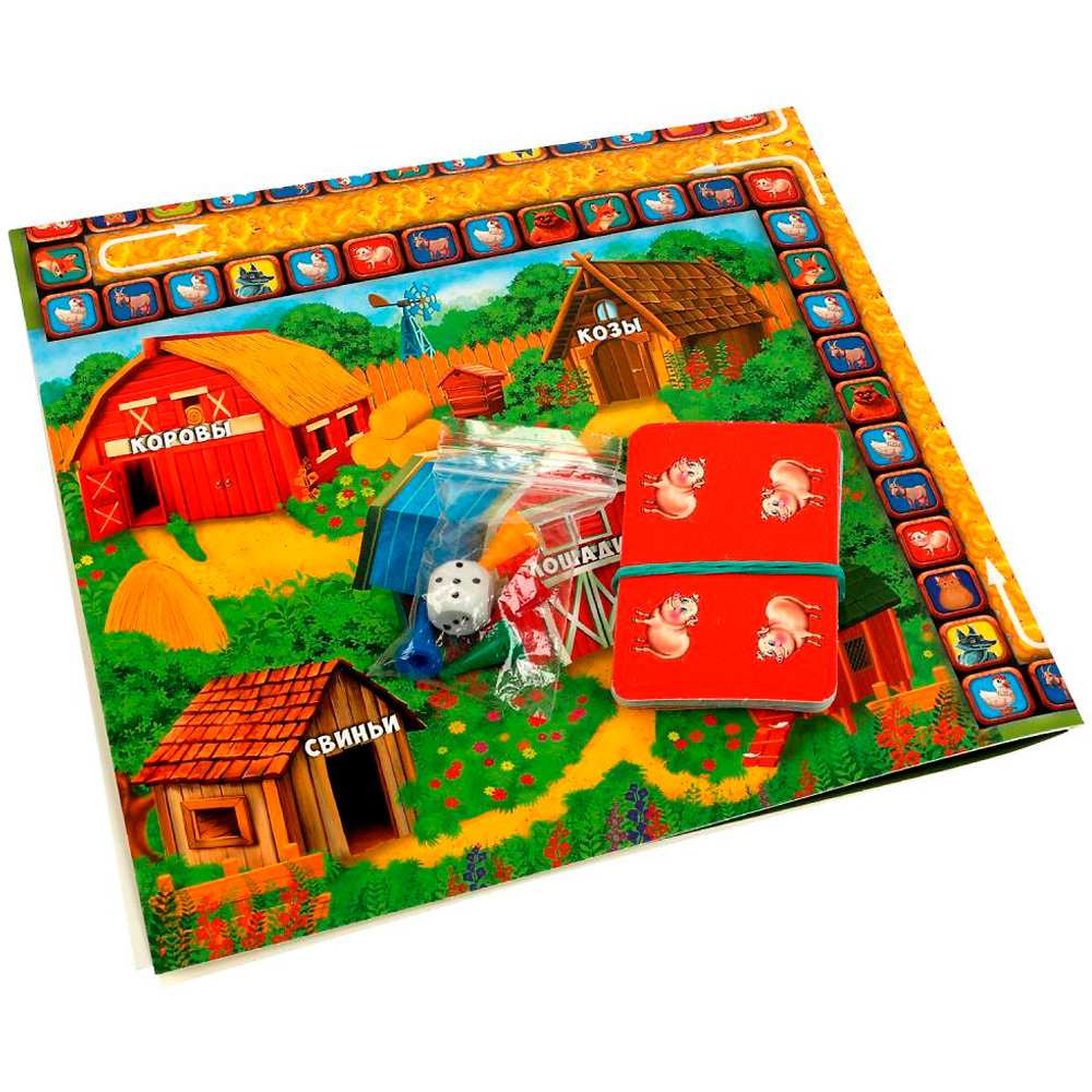 Комплектация: игровое поле, 8 карт «Капкан», 12 карт «Свисток», 32 карты с курами, 24 карты с козами, 24 карты со свиньями, 8 карт с коровами, 16 карт с лошадьми, 8 карт с маленькими собаками, 8 карт с большими собаками