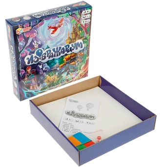 Комплектация: игровое поле, 30 карт с вопросами, 20 карт с ключами, 10 карт для написания букв, 4 фишки и кубик, правила игры