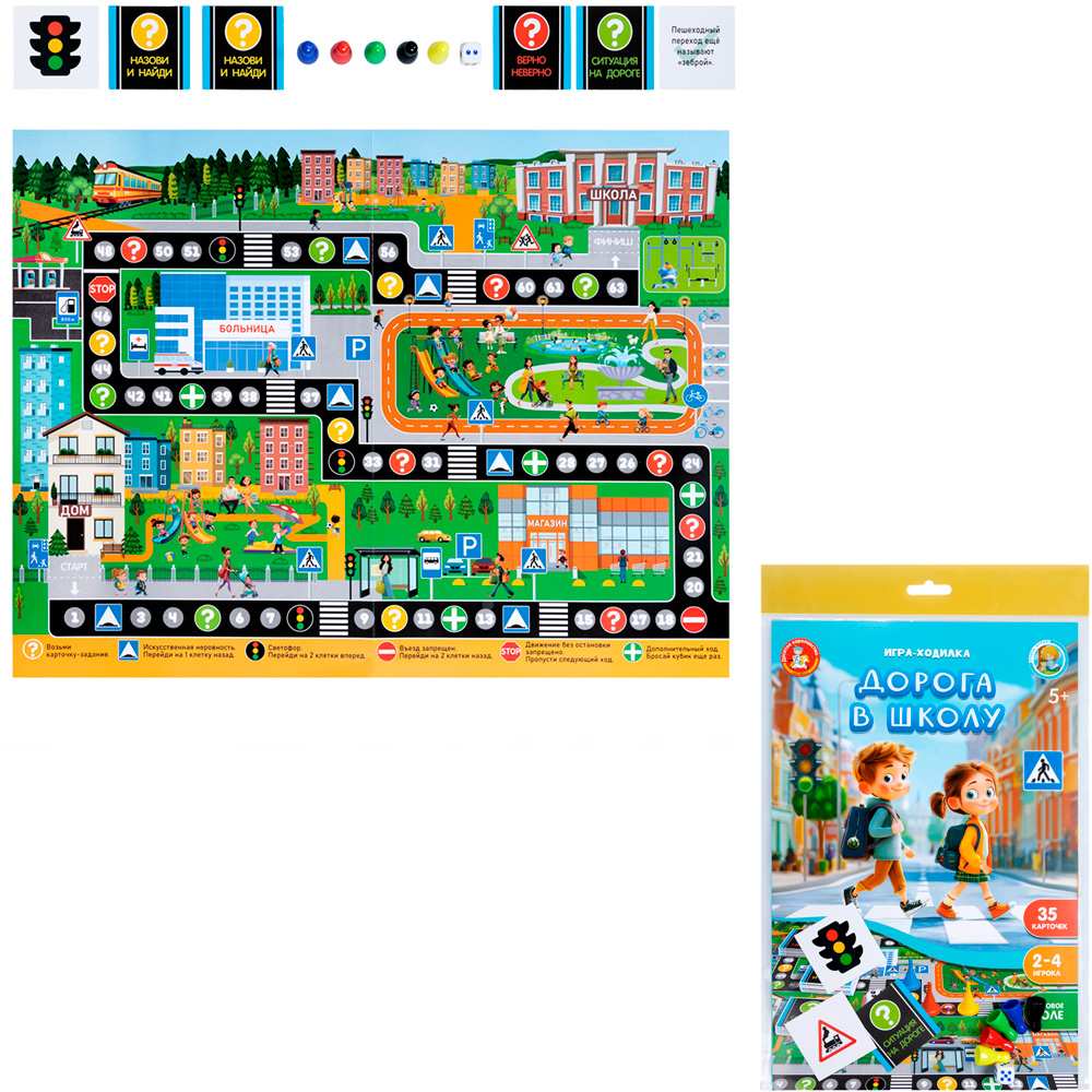 Комплектация: игровое поле - 1 шт., фишка - 6 шт., кубик - 1 шт., карточка - 35 шт., правила игры