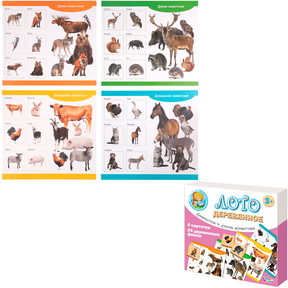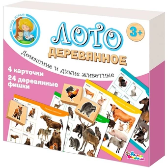 Возраст: от 3 летКомплект: 4 картонные карточки с тематическим картинками домашних и диких животных, 24 фишки.