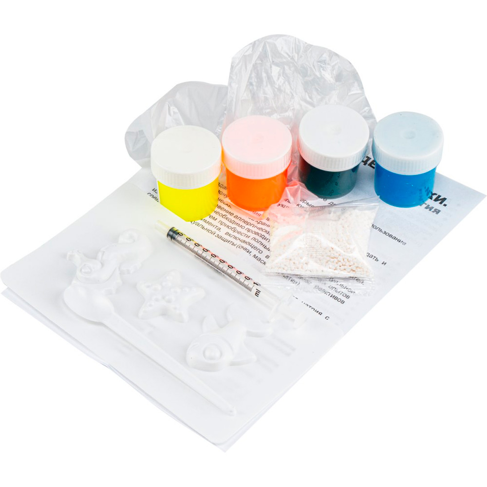 Набор по созданию ярких гелевых фигурок включает в себя все необходимые реагенты. Для создания фигурок необходимо залить гель в форму, опустить формы в специальный раствор и подождать несколько минут.