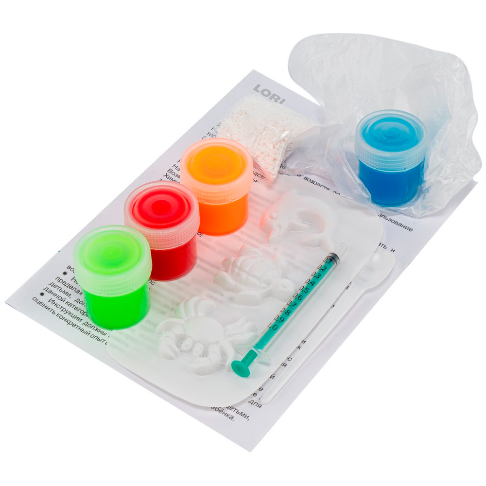 Набор по созданию ярких гелевых фигурок включает в себя все необходимые реагенты. Для создания фигурок необходимо залить гель в форму, опустить формы в специальный раствор и подождать несколько минут.
