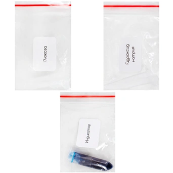 Комплектация: глюкоза, гидроксид натрия, раствор индигокармина, баночка, перчатки