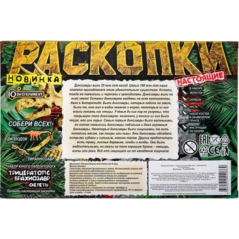 С помощью инструментов, входящих в набор, ребенок сможет снять с бруска слой гипса, откопать фигурку, а остатки гипса удалить щеточкой или при помощи воды.