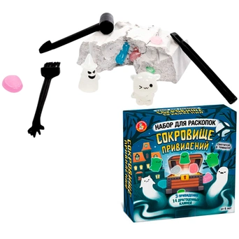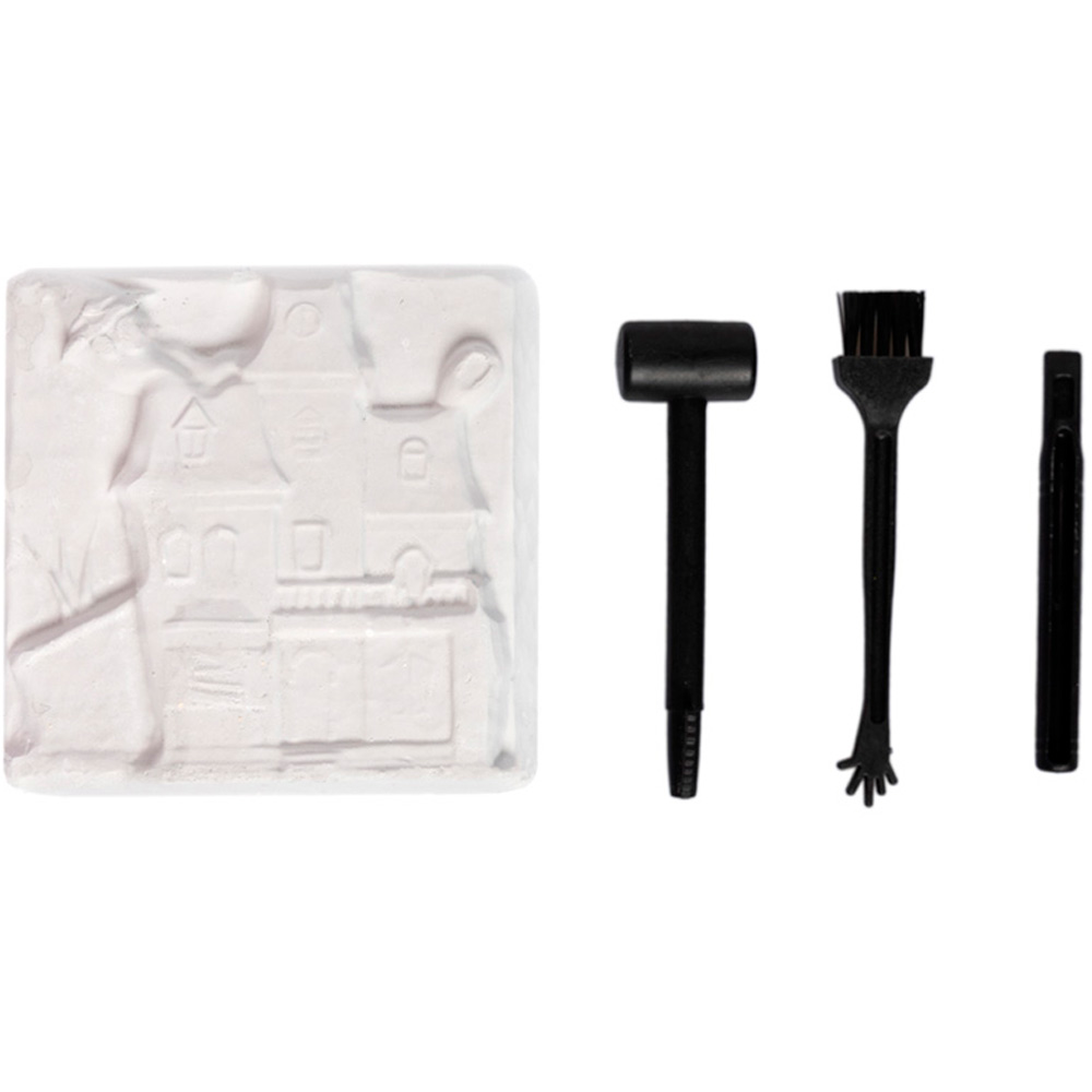 С помощью инструментов, входящих в набор, ребенок сможет снять с бруска слой гипса, откопать фигурку, а остатки гипса удалить щеточкой или при помощи воды.