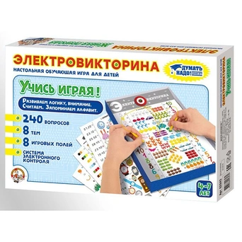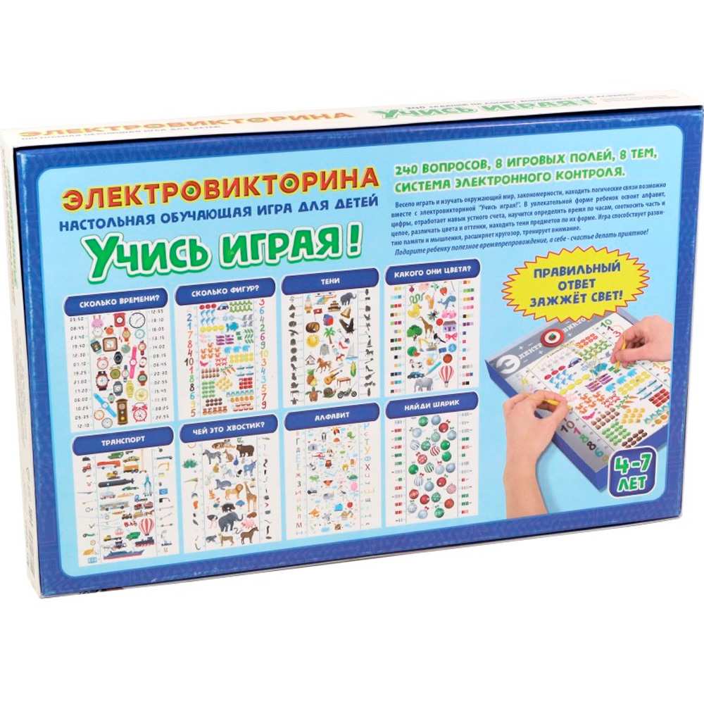 Серия электровикторин «Учись, играя!» создана для обучения и развития детей дошкольного и младшего школьного возраста. В серию входят игры по темам, необходимым для подготовки к школе и успешной учебы. Поля всех игр серии подходят к электронной системе самопроверки «Учись, играя!».
