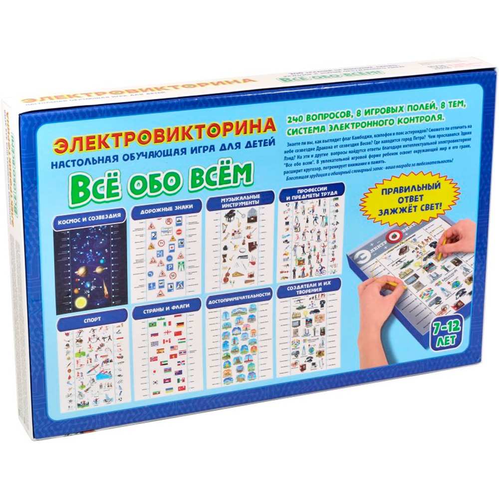 Этот говорящий планшетик - прекрасный подарок для любознательный малышей. Эта обучающая игра познакомит детей с окружающим миром: ребенок узнает, как выглядит флаг Камбоджи, ксилофон и пояс астероидов, сможет отличить на небе созвездие дракона от созвездия Весов, узнает, где находится город Петра, чем прославился Эдвин Ленд. В увлекательной игровой форме ребенок освоит окружающий мир и его грани, расширит кругозор, потренирует внимание и память. Игра рассчитана на 1-2 участников и предназначена для детей в возрасте от 7 до 12 лет. Игра развивает память, произвольное внимание и логическое мышление. Благодаря системе электронного контроля ребенок может игра