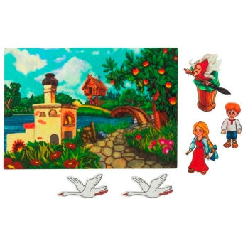 Игра Гуси-лебеди из раздела сказки на ковролине подходит как для театральных игр, так и для сюжетных, а также дидактических занятий аппликацией.