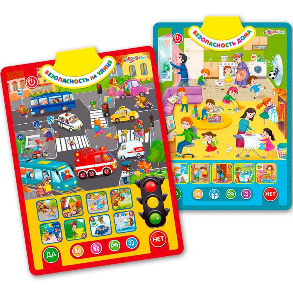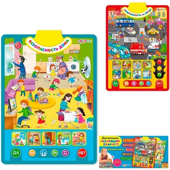 Правила безопасности важно знать всем детям. С этим двусторонним плакатом дети смогут изучить их в легкой игровой форме, нажимая на яркие говорящие картинки. Первая сторона – «Безопасность на улице», вторая – «Безопасность дома». Рассматривай забавные ситуации, изучай правила дорожного движения, слушай песенки, стихи и полезные советы от Саши и Даши.65 правил поведения, 55 вопросов и загадок, 50 интересных звуков, 8 песенок и стихов – всё это поможет детям провести время и весело, и с пользой! Плакат можно повесить на стену любой стороной или играть с ним, где удобно.