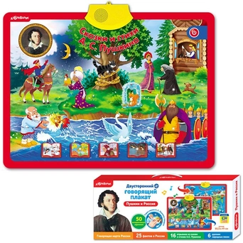 Плакат познакомит малышей с творчеством А. С. Пушкина. На первой стороне этого красочного плаката дети смогут послушать 16 отрывков из сказок и стихов А. С. Пушкина в классическом музыкальном сопровождении. Вторая сторона плаката – говорящая карта России. Нажимая на картинки, дети смогу узнать интересные факты о России, познакомиться с национальными традициями и послушать народные песенки.