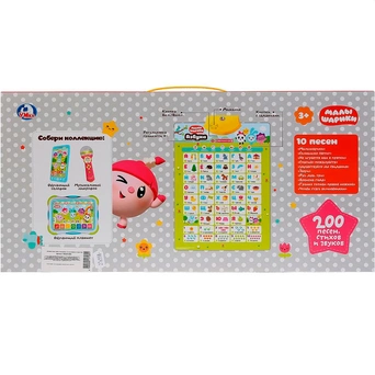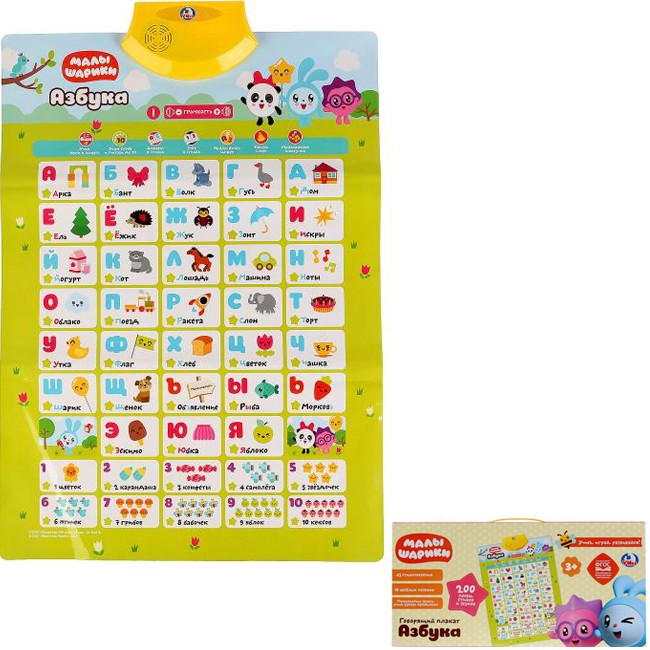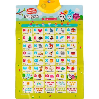 Плакат познакомит малышей с буквами русского алфавита, цифрами и счетом, поможет разучить стихи и песенки. Он представляет собой наглядное пособие для детей. Яркое изделие содержит кнопки, нажав на которые можно услышать звуки, мелодии, слова. Плакат наглядно демонстрирует материал. Развивает память и пространственное мышление ребенка, знакомит его с окружающим миром. Он поможет ярко, весело, а главное, наглядно показать информацию.