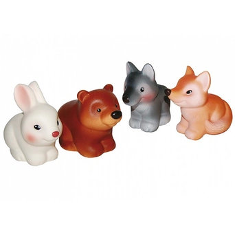 Четыре фигурки лесных зверей - зайца, волка, лисы и медведя. Они соразмерны руке ребенка, приятны на ощупь и помогают развивать мелкую моторику и тактильные ощущения. С таким набором ребенку не будет скучно в ванной и на прогулке, а благодаря качественному материалу изготовления, игрушки просты в уходе.