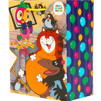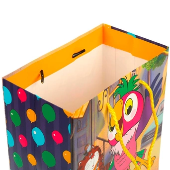 Плотный цветной пакет с ярким принтом позволит разместить подаки на любой случай.