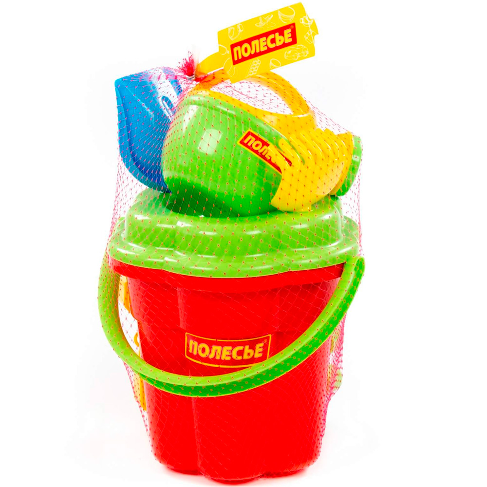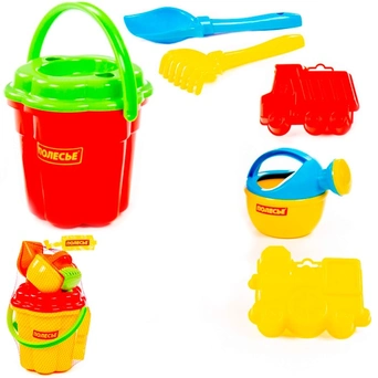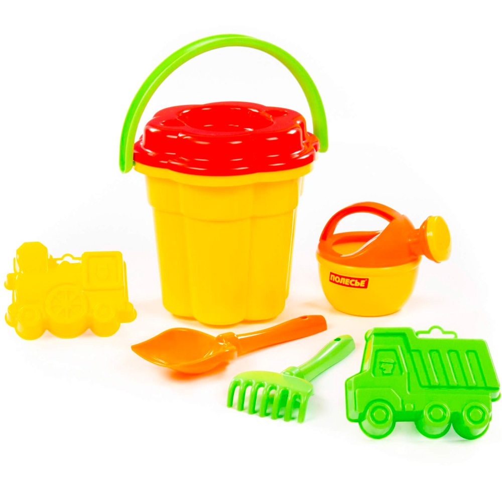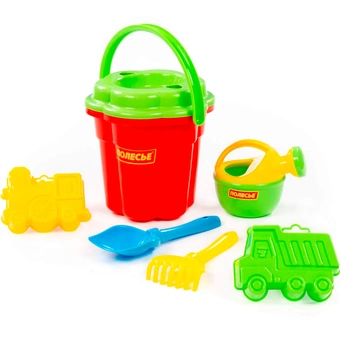 Комплектация: лейка, ведро, сито, грабли, совок, 2 формочкиМатериал: пластик