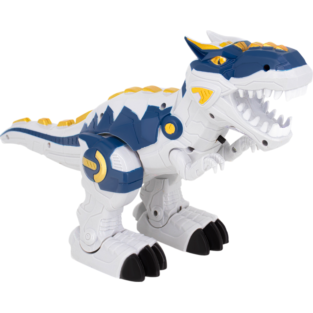 У динозавра подвижные лапы, ходит, рычит, мигают цветные огоньки.