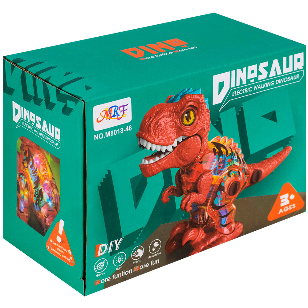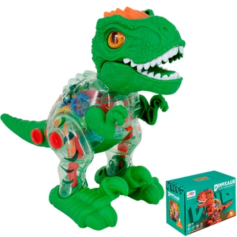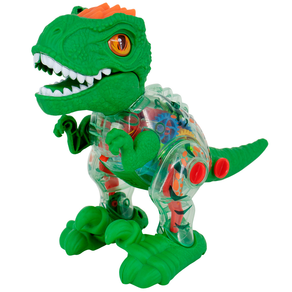 У динозавра подвижные лапы, ходит, рычит, мигают цветные огоньки. Корпус прозрачный, видно, как при движении внутри крутятся цветные шестеренки.