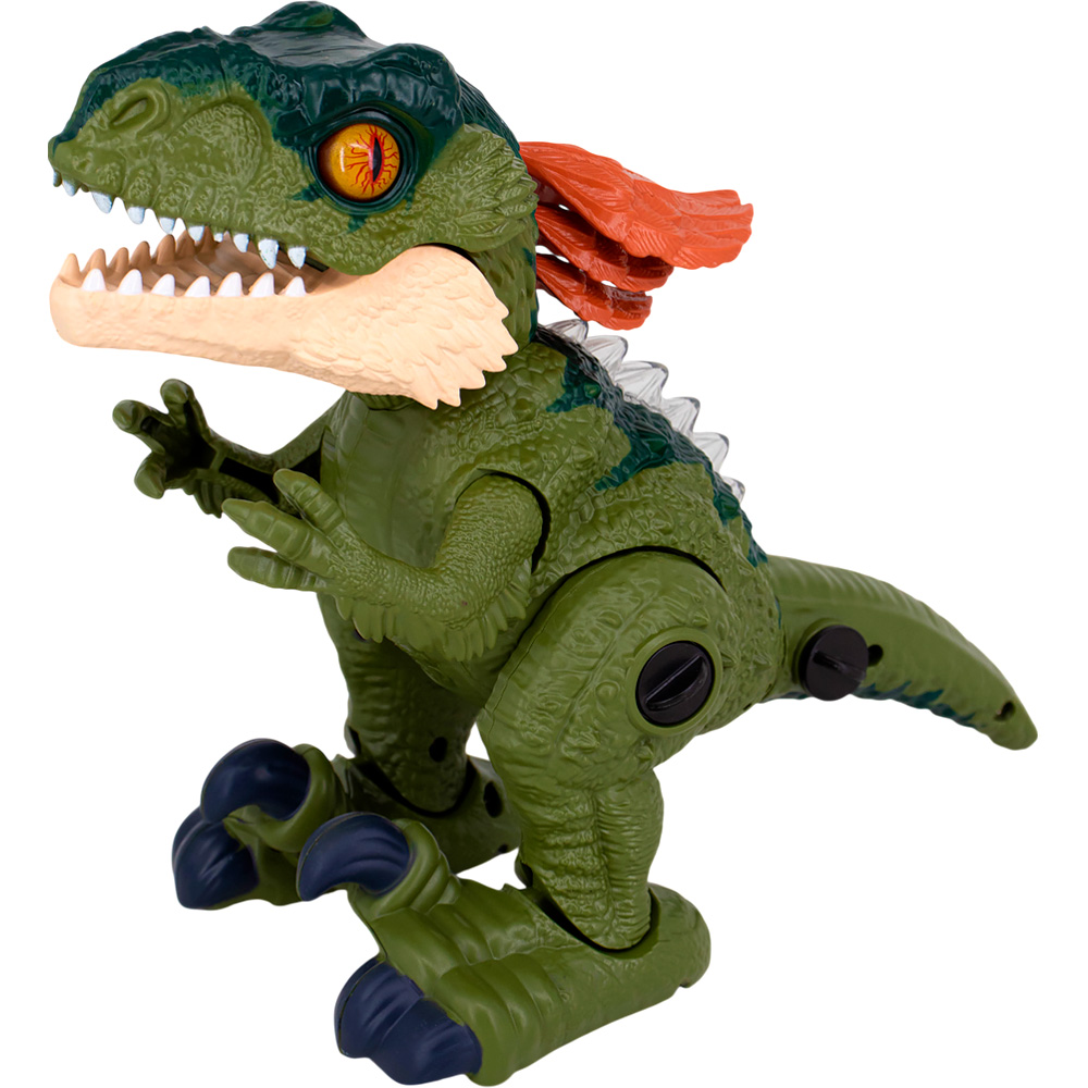 У динозавра подвижные лапы, ходит, рычит, подсветка глаз, открывает рот.