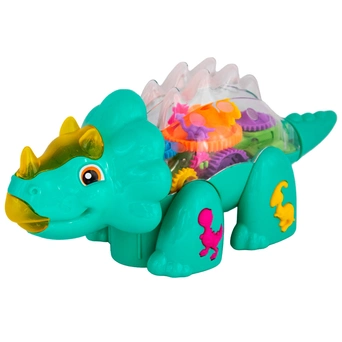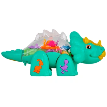У динозавра подвижные лапы, ходит, рычит, мигают цветные огоньки. Корпус прозрачный, видно, как при движении внутри крутятся цветные шестеренки.