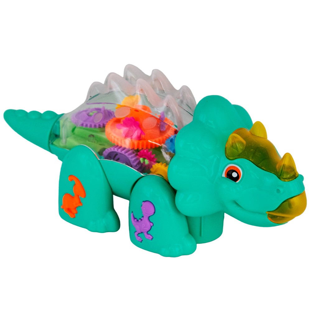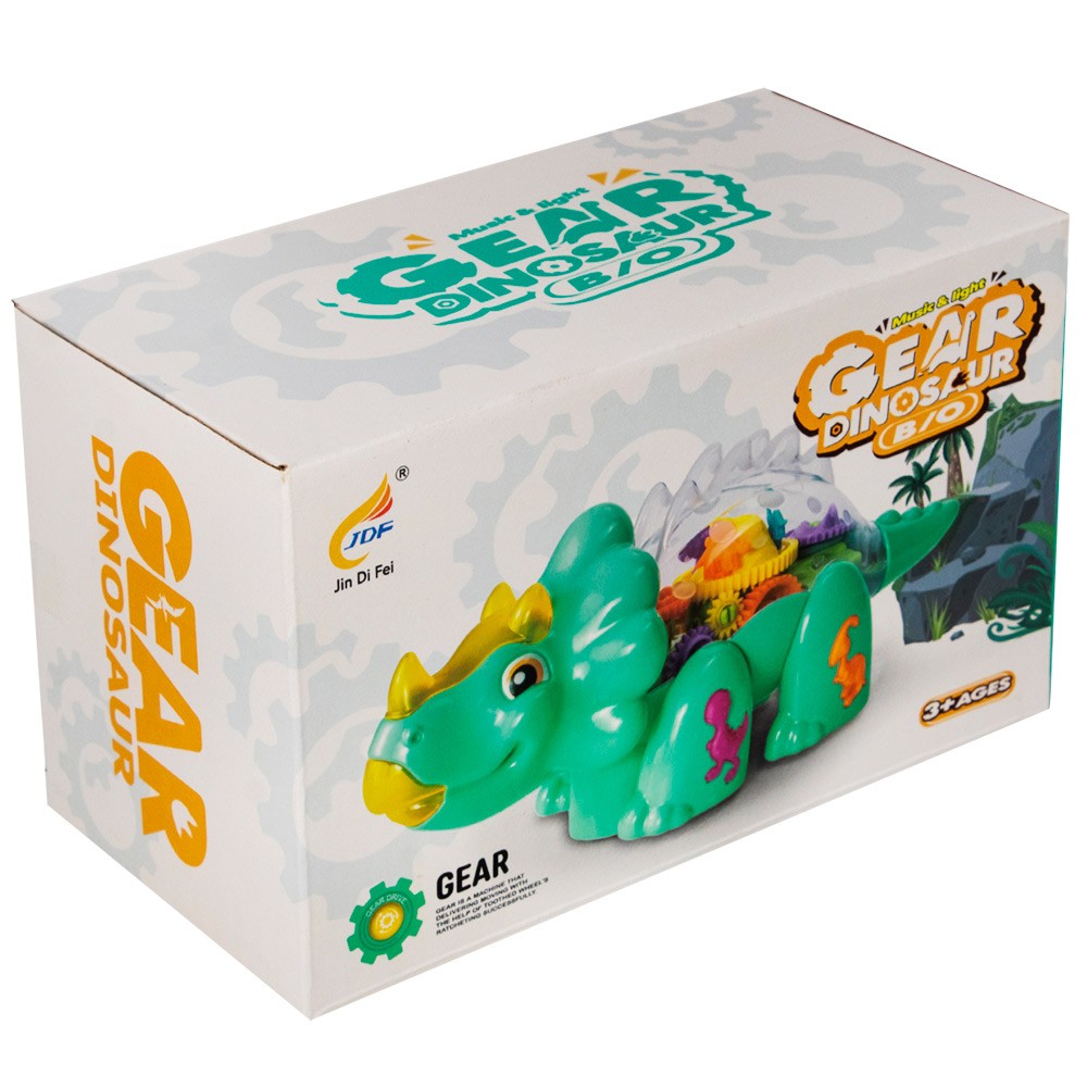 У динозавра подвижные лапы, ходит, рычит, мигают цветные огоньки. Корпус прозрачный, видно, как при движении внутри крутятся цветные шестеренки.