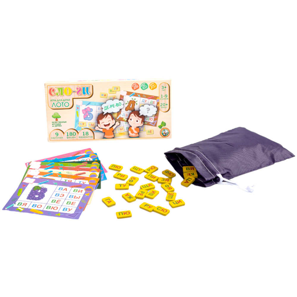 Комплектация: карточки - 9 шт, деревянные фишки со слогами - 180 шт, мешочек - 1 шт