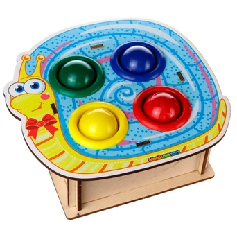 Оригинальная красочная стучалка представляет собой основу с отверстиями, куда нужно вставить цветной шарик и постучать по нему молоточком, чтобы он провалился внутрь.