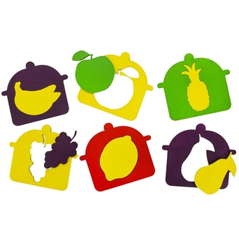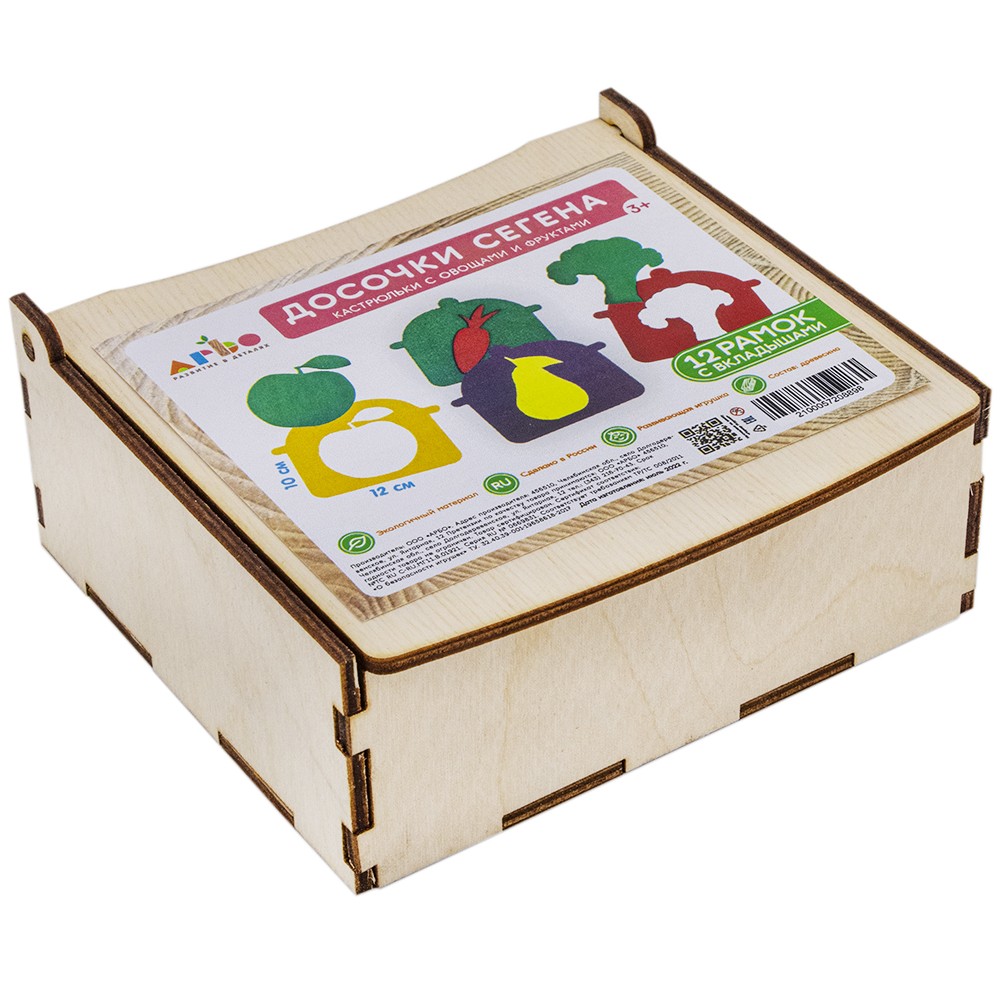 Досочки представлены в виде разноцветных кастрюлек, в которых содержаться яркие пазлы-вкладыши в виде овощей и фруктов. В комплект входит удобная деревянная коробочка для хранения вкладышей.