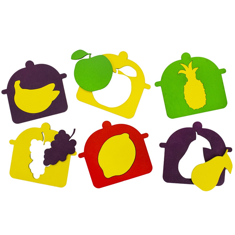 Комплектация: деревянная коробочка (12,5 х 11,2 х 5,4 см), 12 вкладышей (6 овощей и 6 фруктов)