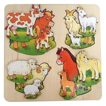 Развивающая доска "Домашние животные" - это полезная и увлекательная игрушка для малышей, которая поможет ребенку получить множество новых знаний. В комплект входит рамка с отверстиями, а также 12 вкладных элементов в виде четырех разных семейств, обитателей фермы - коров, коз, барашков и лошадей. Каждая семейка состоит из мамы, папы и детеныша - рассматривая фигурки, ребенок познакомится с понятием "большой-средний-маленький", узнает название и внешний вид животных, потренирует навыки логики, зрительного восприятия, мелкой моторики и сообразительность. Все элементы изделия выполнены из экологически чистого материала - дерева, хорошо отшлифованы и окрашены безопасными нетоксичными красками.