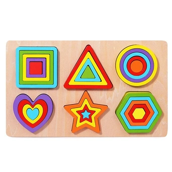 Деревянная игра состоит из основы и различных фигурных элементов, которые нужно располагать по принципу рамок и вкладышей.