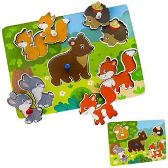 С помощью такой игрушки можно придумать множество занимательных игр. Например, попросить малыша назвать всех животных, которые он видит на деревянной досочке, и придумать сказочные истории. Также, ребёнок сможет играть самостоятельно. Ему будет интересно вынимать вкладыши в виде милых зверят и вставлять в ячейки, держа за цветную кнопочку.