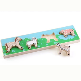Деревянный пазл основан на принципе рамок и вкладышей. Малышу необходимо разместить красочные фигурки животных в соответствующую по форме рамочку. В процессе занимательной игры ребенок познакомится с дикими животными, а также понятиями цвета и размера. Цветные элементы достаточно крупные. Многообразие форм вырубки и различные размеры отдельных элементов способствуют развитию мелкой моторики у малышей. Сделанные из высококачественной древесины, они не деформируются и легко берутся в руки. Сборка головоломки способствует развитию внимания, логического мышления, усидчивости и подарит массу положительных эмоций. Все детали данной игры изготовлены из экологически чистых материалов.