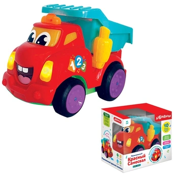 • Самосвал едет под музыку и поет 3 песенки («Песенка Красного самосвала», «Песенка-считалочка», «Песенка про цвета»).