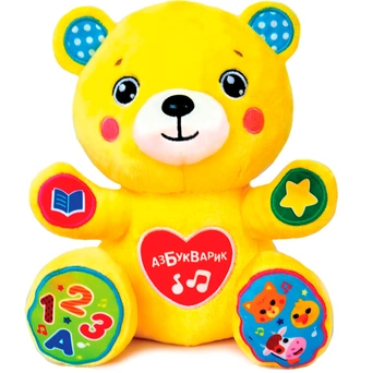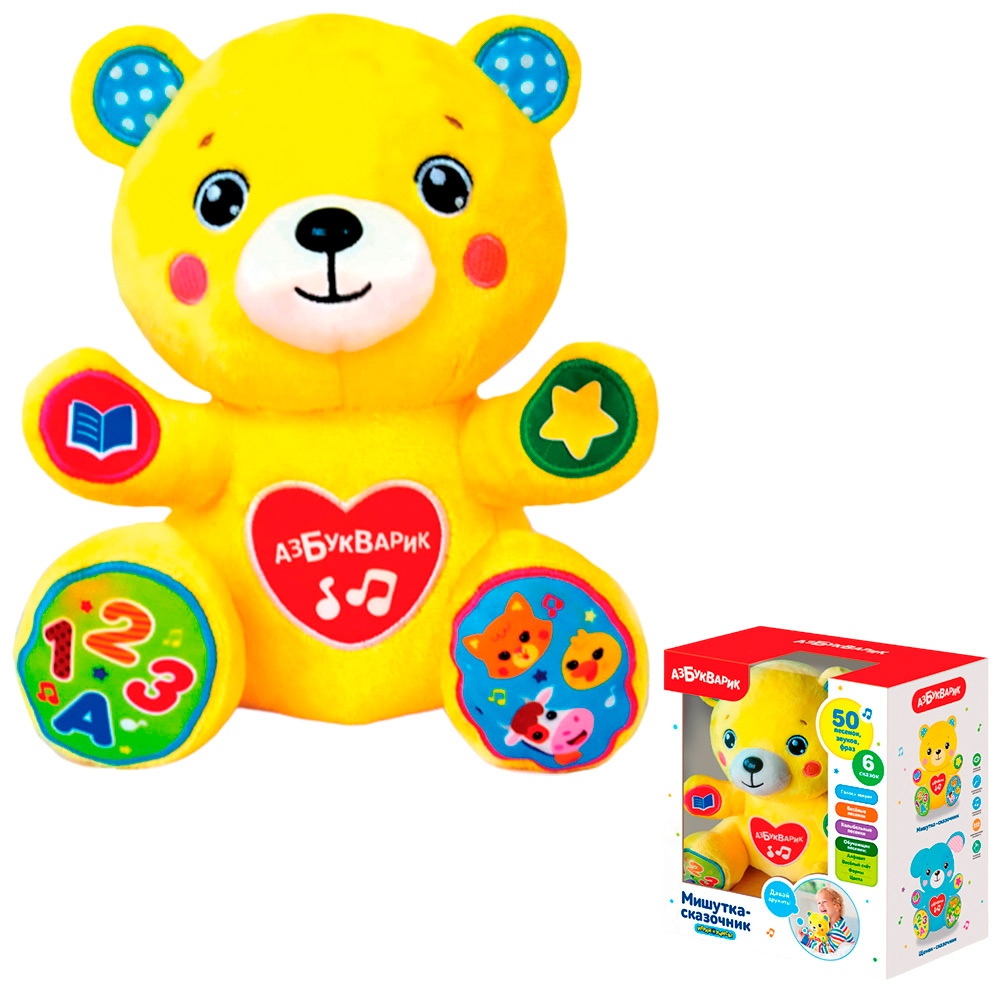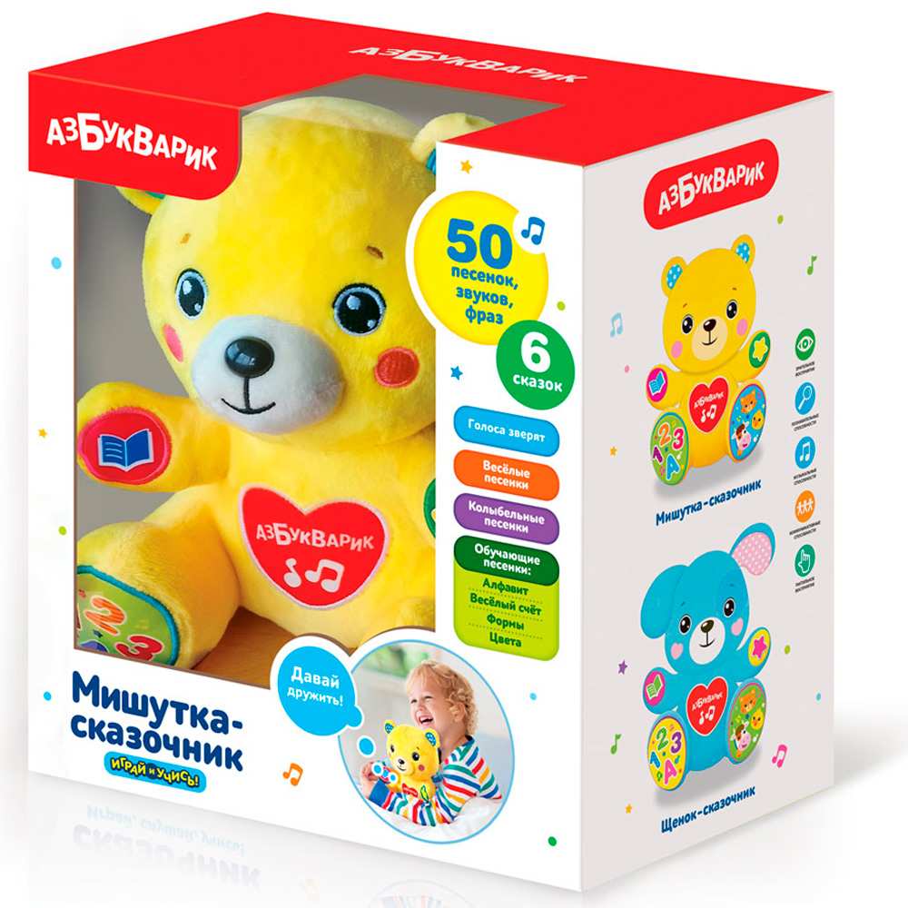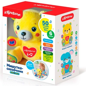 Сказочник умеет разговаривать голосами зверят и расскажет ребёнку 6 сказок: «Курочка Ряба», «Три медведя», «Солнышко», «Пузырь, соломинка и лапоть», «Репка», «Гав-гав». Он споет 4 обучающие песенки про алфавит, счет, формы и цвета, 6 веселых песенок о зверятах.