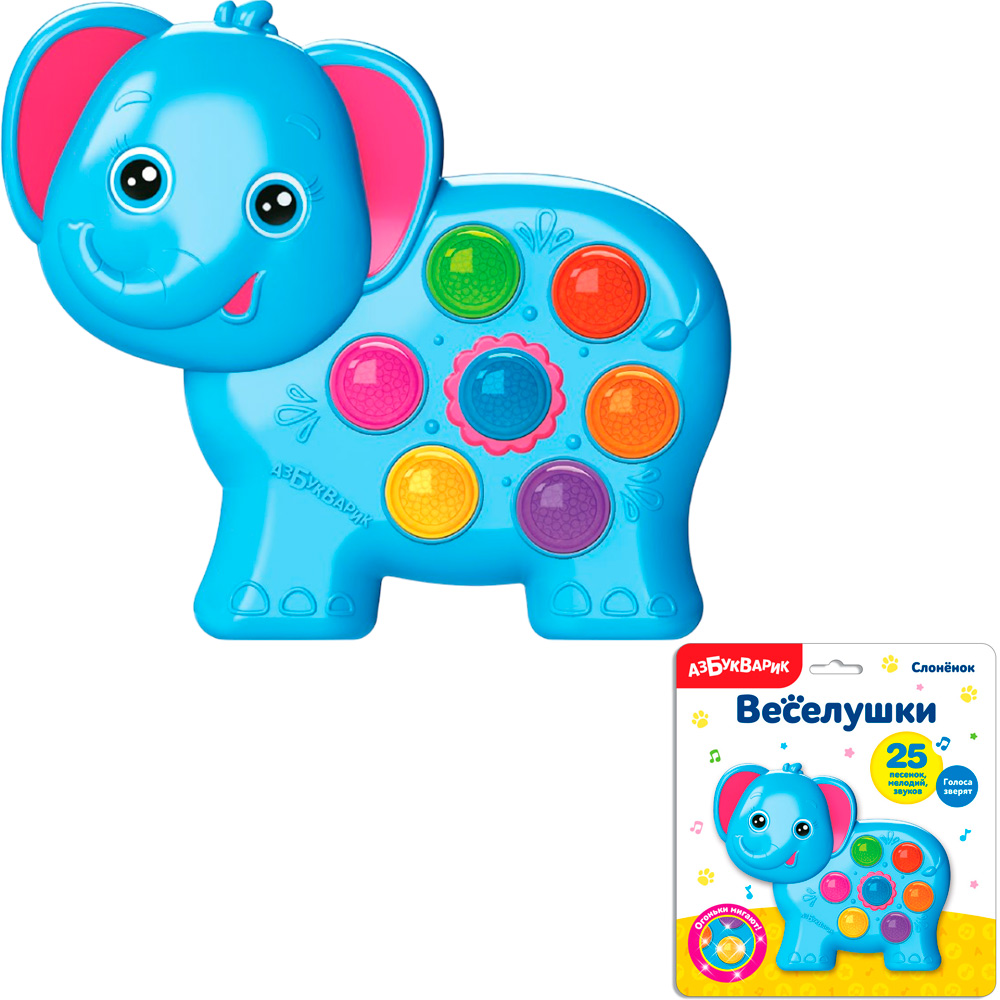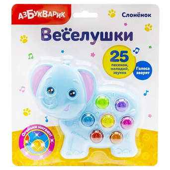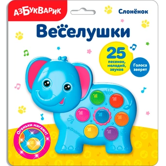 Веселая игрушка «Слонёнок» из серии «Веселушки» подарит вашему малышу море положительных эмоций, много веселья и хорошее настроение. Игрушка выполнена в форме слонёнка. Малыш с большим интересом будет нажимать на яркие кнопочки и слушать веселые, добрые песенки.