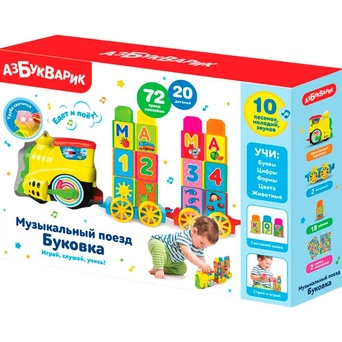 Комплектация: музыкальный паровозик, 2 вагончика, 18 кубиков и 72 яркие наклейкиМатериал: пластик, бумага