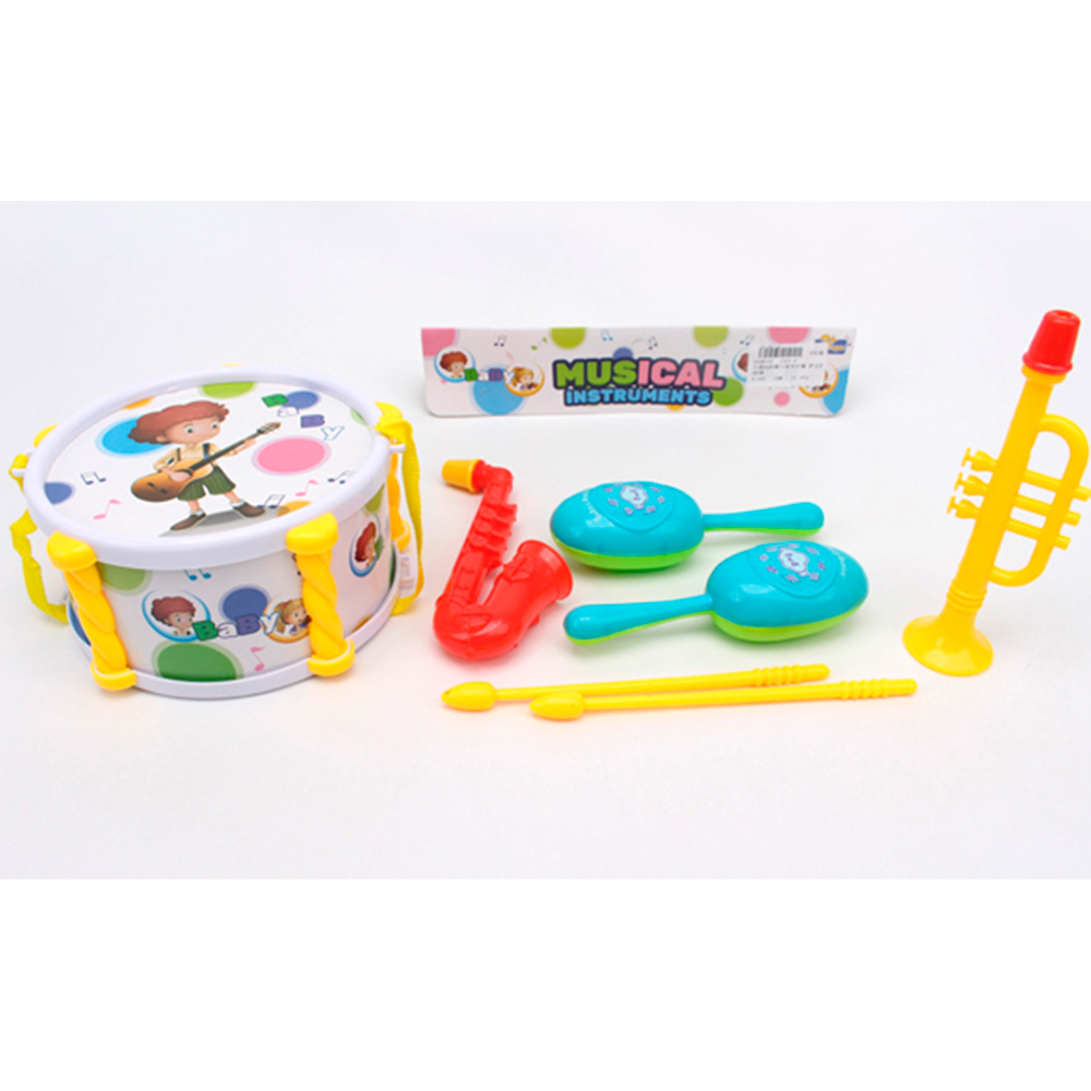 Комплектация: барабан - 1 шт, палочки - 2 шт, погремушки - 2 шт, труба - 2 шт