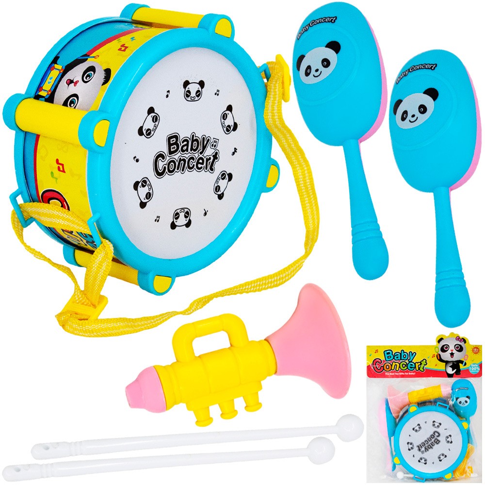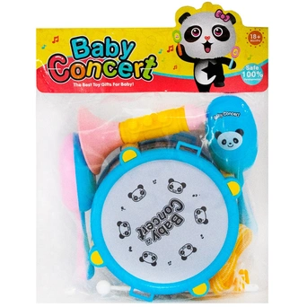 Комплектация: барабан - 1 шт, погремушка - 2 шт, палочки - 2 шт, дудка - 1 шт