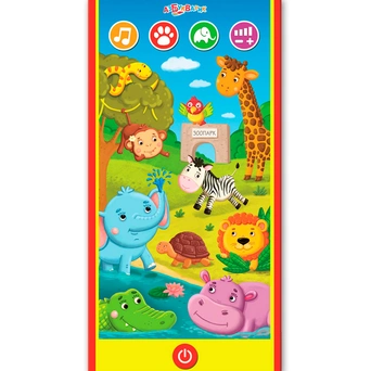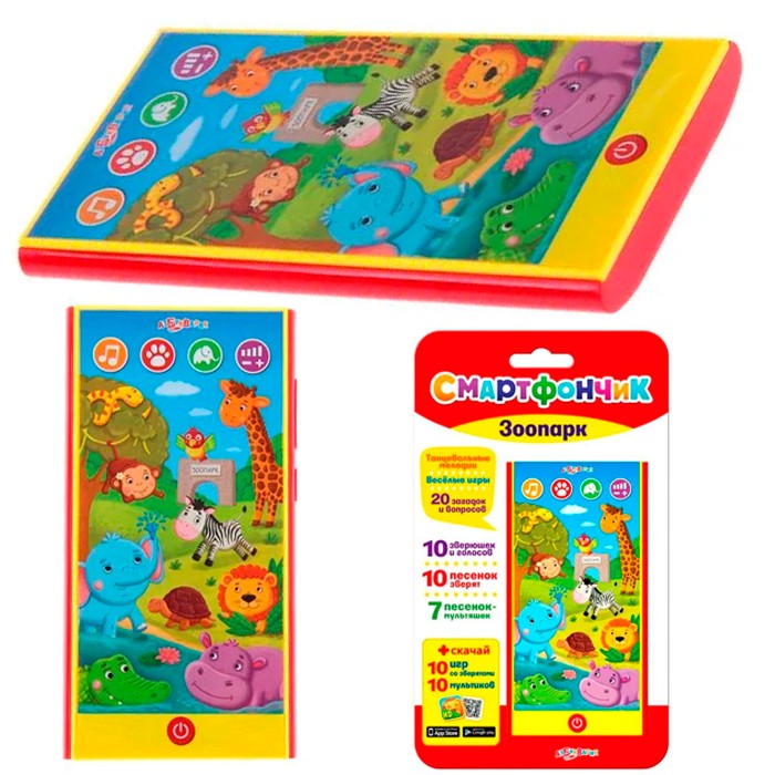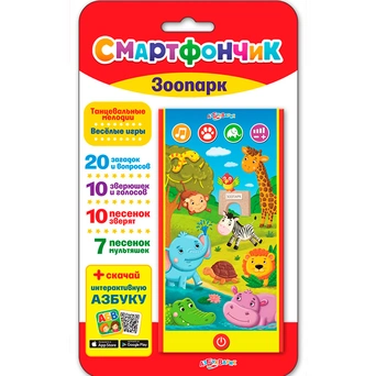 Ваш малыш любит животных? Интерактивный смартфончик «Зоопарк» познакомит его с обитателями жарких стран: львом, слоном, бегемотом, крокодилом и другими. Нажимай на картинки – и зверюшки споют о себе веселые песенки! Переключай режимы – отгадывай загадки, угадывай голоса животных, слушай хиты из мультиков: «Чунга-чанга», «Песня Львёнка и Черепахи», «Песенка о жирафе», «Песенка о лете», «Песенка друзей», «Песенка мамонтёнка», «Настоящий друг».