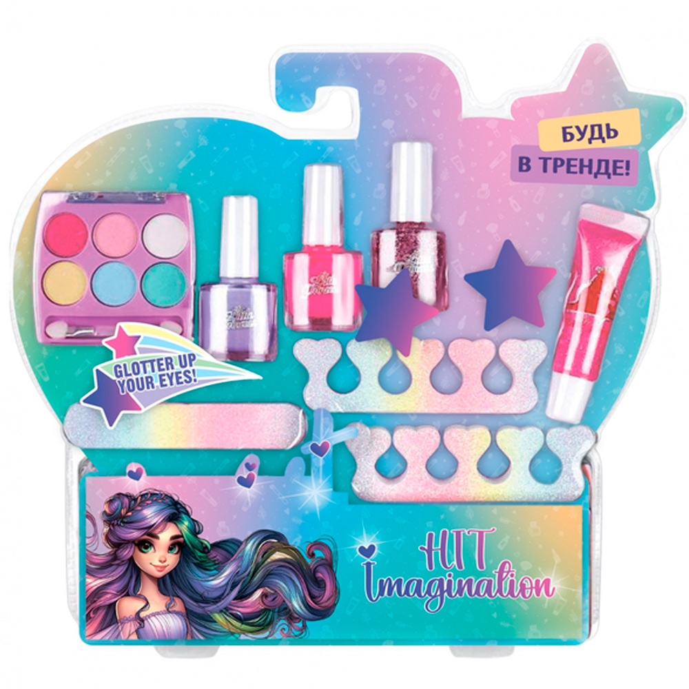 - Комплектация: блеск для губ — 1 шт., лак для ногтей — 3 шт., разделитель для пальцев — 2 шт., тени для век — 6 цветов, аппликатор — 1 шт., пилка — 1 шт.