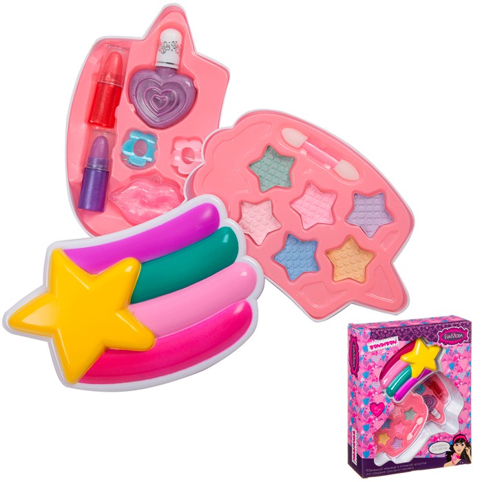 - Комплектация: косметичка-звёздочка, тени для век (6 оттенков, 3 г), помада (2 оттенка, 1,6 г), блеск для губ (1,2 г), лак для ногтей (5 г), аппликатор, заколки (2 шт.)