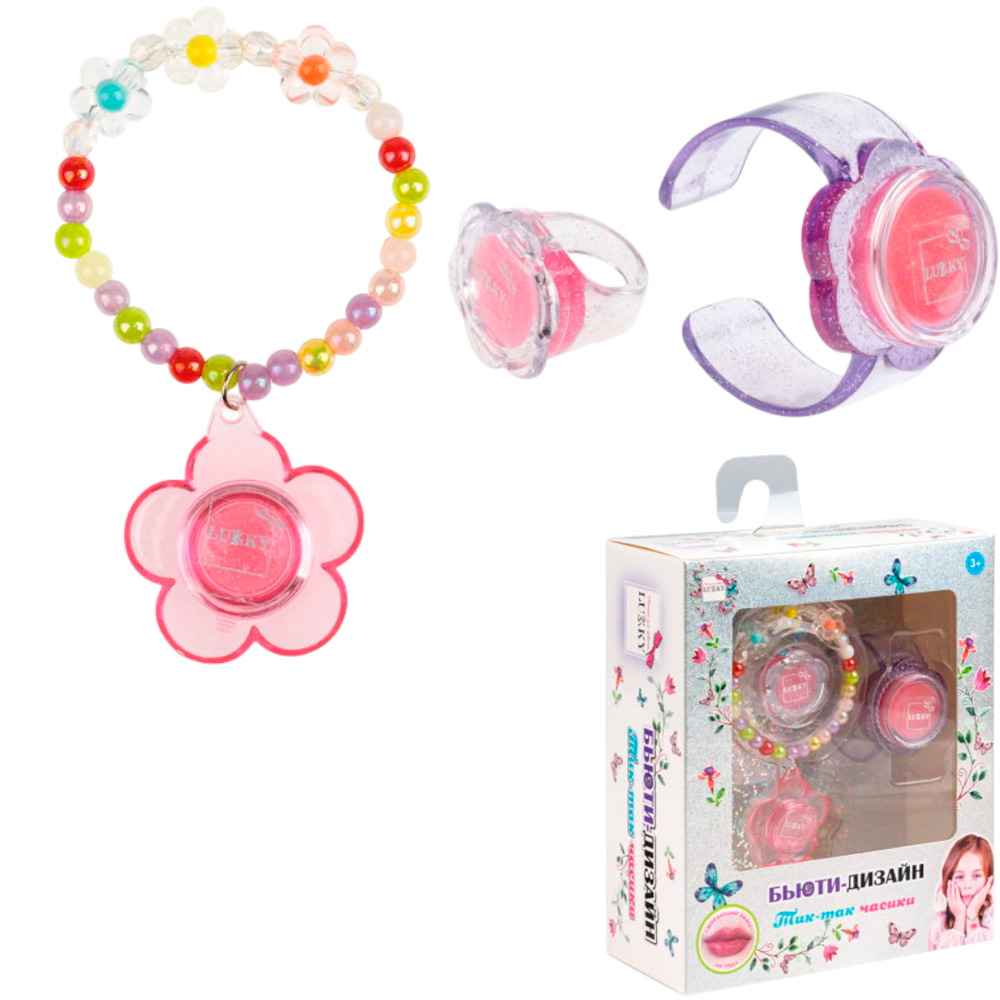 Комплектация: бальзам для губ в упаковке в виде часов на браслете, блеск в миниатюрной сумочке, кулон-бальзам в форме цветка на бусинках