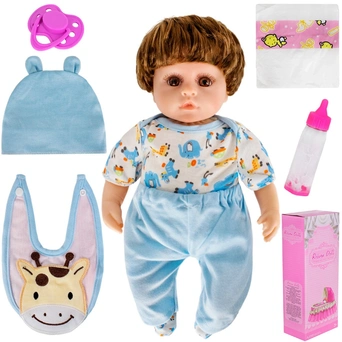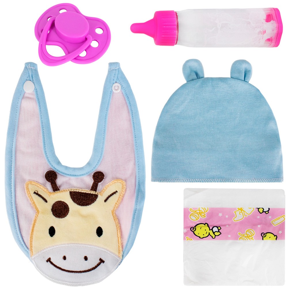 Комплектация: пупс - 1 шт., бутылочка - 1 шт., штаны - 1 шт., футболка - 1 шт., шапка - 1 шт., пустышка - 1 шт., подгузник - 1 шт.