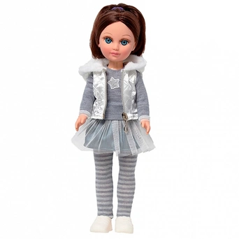 Анастасия Весна 8 выполнена в образе девочки подростка и выглядит весьма стильно. Она одета в вязаный джемпер с аппликацией, юбку из трикотажа и сетки, простроченный жилет с капюшоном, теплые лосины в полосочку и туфли. Кукла имеет вставные закрывающиеся глаза, руки и голова выполнены из качественного винила, туловище и ноги - из пластмассы. При нажатии на звуковое устройство, расположенное на спинке, кукла произносит следующие фразы: