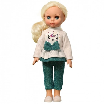 Кукла одета в белый свитер, на котором изображен котик, и в зеленые укороченные брючки. Одежда легко одевается и снимается. Волосы у Эли можно расчесывать, укладывать и делать разные прически. Играя в куклы у малыша развивается воображение, чувство стиля и вкуса социально-коммуникативные навыки.