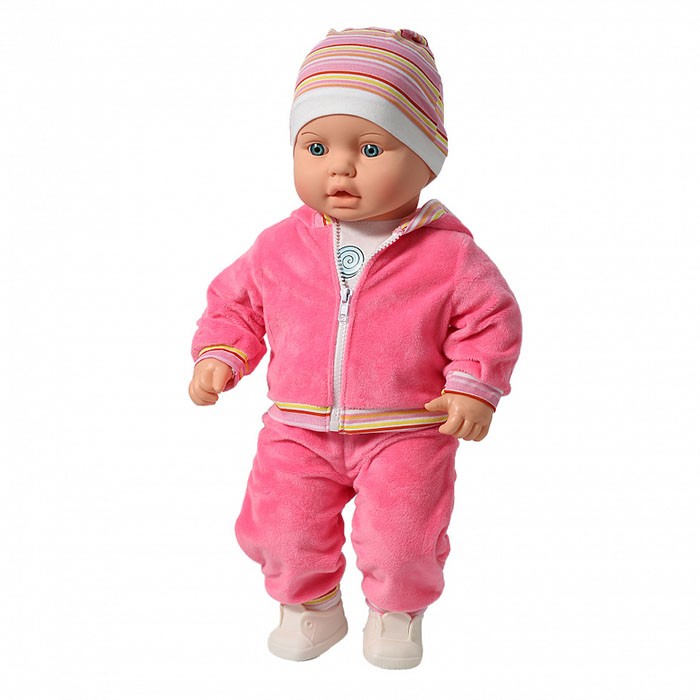 Кукла Влада Нежность непременно станет одной из любимых игрушек девочки. Влада очень похожа на настоящую малышку: у нее пухлые щечки и губки, ясные глаза и детские пропорции тела, что позволяет играть с ней в дочки-матери и другие сюжетно-ролевые игры. Ручки и ножки Влады подвижны, на голове - рельефный паричок, вставные глаза, звуковые устройства отсутствуют, материал изготовления - винил разной плотности. Благодаря подвижным ручкам и ножкам, Владу можно переодевать, укладывать спать и садить, что разнообразит игровые сюжеты. В комплект одежды куклы входят: брюки и курточка из велюра, футболка с аппликацией в виде леденца, а также носочки, трусики и шапочка.