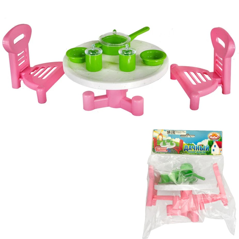 Размеры упаковки-14x14x7смЛюбой девочке хочется, чтобы у ее кукол было как можно больше аксессуаров для интересных и увлекательных игр. Яркая мебель с комплектом посуды станет прекрасным подарком для Вашей малышки! В «Дачный» комплект входит: стол круглый, 2 стула, 5 предметов посуды. Набор подходит для кукол ростом до 15 см.