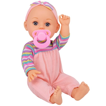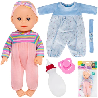 Комплектация: пупс (33 см) – 1 шт., соска-пустышка – 1 шт., бутылочка (12 х 5 х 5 см) – 1 шт., комплект одежды – 1 шт.