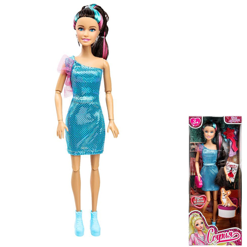 Комплектация: кукла - 1 шт., бижутерия, платье - 1 шт., туфли - 1 пара, питомец - 1 шт., аксессуар - 2 шт.